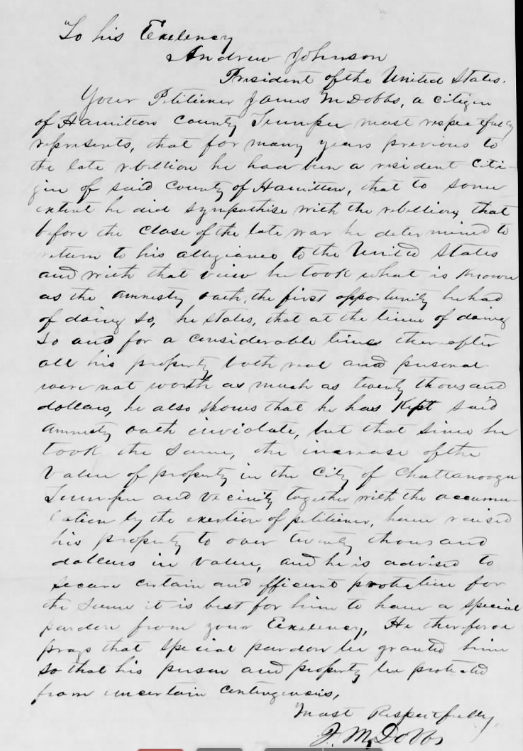 Two of the pages to the pages are letters of reference signed by a handful of citizens of Hamilton County. They state that James Monroe Dobbs is “praying for a special pardon”, that they have known him for many years, and that he is an upstanding citizen who has taken the amnesty oath in good faith and who wishes to become a loyal citizen of the United States. In each of those letters the undersigned respectfully ask granted special pardon.