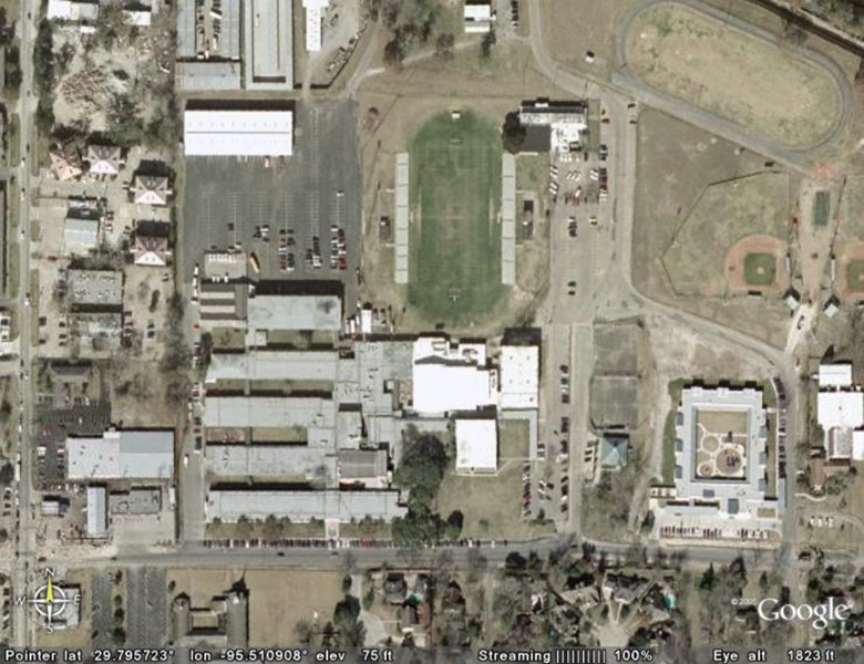This is where I went to school from 1966 to 1969 (6th thru 8th grade). This picture must have been taken in the winter when all the grass in Houston turns brown (California dreaming?). That is Interstate 10 (Katy freeway) on the left. In this picture east is up and west is down. I knew back then that I-10 eventually ended at the pier in Santa Monica, California, and most days back then I would dream of the day when I could just get on that freeway go all the way to Hollywood, California.