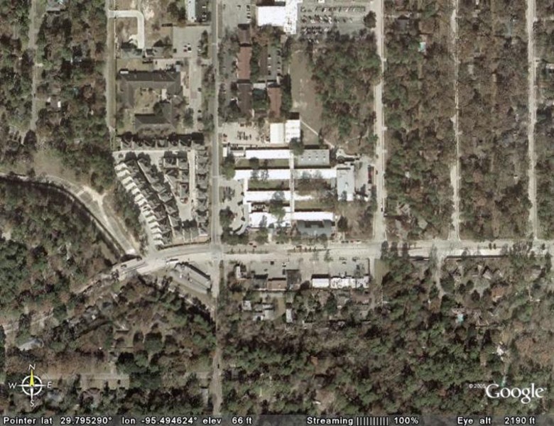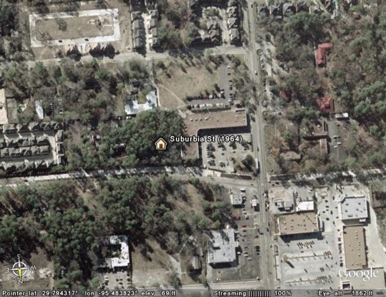 In 1964 my Dad left Sam Houston Hospital to work for St Joseph’s Hospital in downtown Houston. My parents decided to have a house built and while the house on Cedarbrake was being built we lived in this scary little house on a dead-end street called Suburbia. It is hard to tell from this picture, but it appears that the house is no longer there. I remember that when we lived here my favorite television show was The Munsters and I thought that our spooky house in the woods was as scary as Mister Munster’s TV house on Mockingbird lane. Back then Westview Dr (right/left) ended at Wirt Rd (up/down) and on the other side of Wirt was the dead-end street called Suburbia. On the southwest corner of Westview and Wirt was a Unitarian Church (right center). Across Wirt from the church and next to our house was a large wooded lot. The wooded lot now has an L-shaped building on it. Sometime in the 70’s Westview was extended and Suburbia street ceased to exist. The red roofed buildings on the right of the picture were part of a Montessori school next to the Unitarian church.