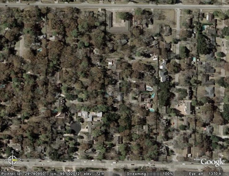 From 1965 to 1973 we lived on Cedarbrake street. In this picture you can barely make out the street because the foliage of the trees hides most of it (Houston is a semi-tropical jungle). In the upper part of the picture is Voss road running left to right and on the bottom of the picture is Bingle road running left to right. Cedarbrake is a dead-end street off on Bingle road that ends in a cul-de-sac and our house was at the end of the cul-de-sac.