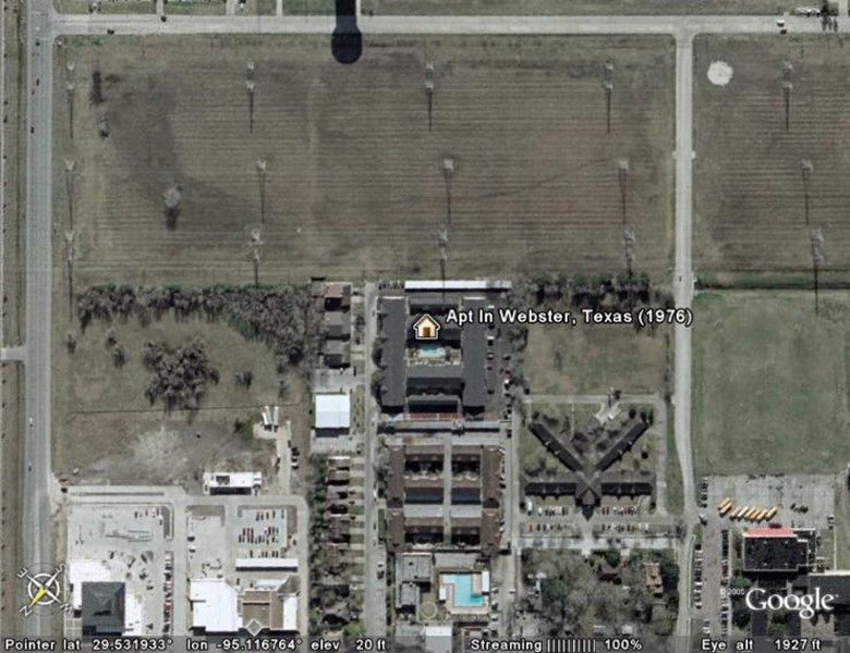 In 1975 my girlfriend & I had broken up and things were not going well at home. So, I left my parents’ home and move into an apartment in Webster, Texas. Webster is a small town just off the Gulf freeway (I-45) and was un-officially the gateway to the Johnson Manned Space Craft Center (NASA). When the astronauts landed on the moon and said, “Houston we have landed” perhaps they should have said “Webster we have landed”. On the left of the picture is Old Galveston Hwy. Southeast is in the upper part of the picture so if you were to follow that up it leads to Texas City and eventually to the bridge to the island at Galveston bay. Those strange looking “trees” in the upper part of the picture are high tension power lines.