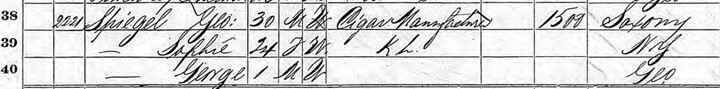 The photograph taken in Savannah Georgia is denoted as the mother of my great grandmother, Helen D Spiegel whom I know to be Sophia B. Spiegel. At the time what I knew of Sophia is that she was born in 1846 in New York City, that both her parents were born in the Bavaria, and that she died sometime between 1880 and 1887. She was listed in the 1870 U.S. Census age 24 living in Savannah Georgia, married to George C Spiegel, age 31, a cigar maker, and their son George, age 1. The record shows her birthplace as New York.