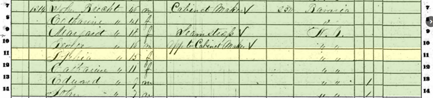 None of those terms gave positive results for the 1850 census. Yet I struck gold with “Brecht” in 1860 US Census. It was New York City’s Ward 11 District 1 where I found the family of John Brecht, a cabinet maker with a wife and six children. One daughter is named Sophia. She is listed as age 15 and birthplace New York. Here was a match with our Sophia B. Another little detail to note is the mother and one of sisters were both named Catherine – a name Sophia B. gave to one of her daughters.