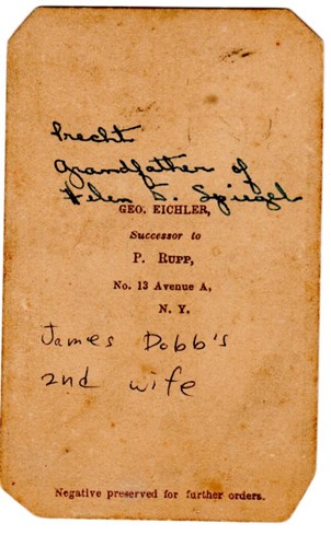 Looking for more clues, I went back to the photo of Herr Precht and had a closer look. Lo and behold, there is a clue printed on the back of the photograph that lends weight that the family who lived in 19th C. Alphabet City Manhattan was the family of my great-great grandmother, Sophia B. Spiegel (1845- bef. 1887) .