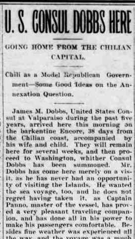 He spoke highly of his time in Chile and when asked his opinion of the annexation of Hawaiian Islands he said that “he had followed the matter very closely in the American press and was convinced that the islands will surely be annexed during the present session of Congress. The annexationists, he said had been very judicious in their distribution of literature throughout the United States much of which was placed directly in the homes. The best people, in his estimation, were advocating the cause, which is also receiving support from the clergy of the country, all of which are potent factors.”