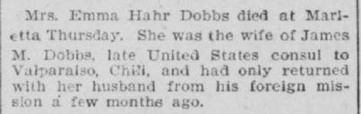 I found one of the death notices of Emma Hahr Dobbs; this one was published in the July 17, 1898 edition of The Morning News (Savannah Georgia). Emma was an internationally known pianist of high regard. The child, named James Monroe, was born in Chile and was only a few months old when the family traveled to the United States. It is unknown what the cause of death was for the mother and the child.