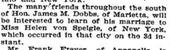 There were a more than few curious things that I found in the newspaper archives. For example, my great-grandparents, James M. Dobbs and Helen Spiegel, his second wife, were married in New York City in August of 1901. It appears they may have eloped; she was from Dallas Texas and he was from Marietta, Georgia. Also, He was nearly 15 years older than her. Her grandparents and mother, all now deceased, had at one time lived in Little Germany on the lower east side of Manhattan. The only other connection I have found to NYC is that the family spent a number of vacations on Staten Island. An announcement of their marriage appeared in the Atlanta Constitution.
