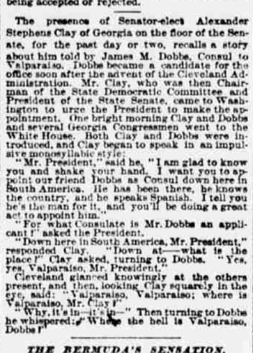 In 1897, the New York Sun published a story in its Washington News column on page 9 of the 28 Feb 1897 edition that told of when my great-grandfather was escorted to the White House to meet with Pres. Cleveland for the first time regarding his appointment to the post in Chile. The story was told by my great-grandfather to a Washington reporter about the meeting in 1893 when Sen. Clay was a Georgia state senator and state chairmen of the Democratic Party. In 1896, Clay was elected to the US Senate.