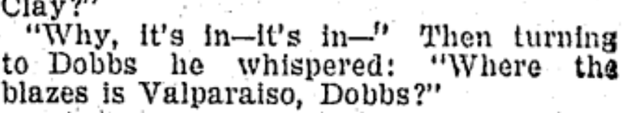 Then 13 years later, a few weeks after Senator Clay had passed away, the exact same story was reprinted in a Washington DC newspaper. The story told in the January 4, 1911 addition of the Washington Herald was almost identically word-for-word rehash except for two modifications. For one, while it did mention my great-grandfather by name, it does not attribute him as being the source of the story. Secondly, instead of the Senator saying, “where the hell…“, in this retelling it had him say “Where the blazes is Valparaiso, Dobbs?“