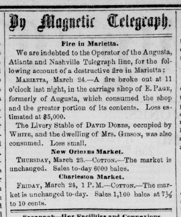 In the 25 March 1854 edition of the Augusta Daily Chronicle and Sentinel there is a section titled “By Magnetic Telegraph“. In the first item is a report of a fire in Marietta Georgia. The item begins with “we are indebted to the operator of the Augusta, Atlanta and Nashville telegraph line for the following account of a destructive fire in Marietta.” It reports that a number of buildings were destroyed in Marietta. Loss estimated to be $5000. It states “the livery stables of David Dobbs, occupied by White, and the dwelling of Mrs. Gibson, was also consumed. Loss small.“
