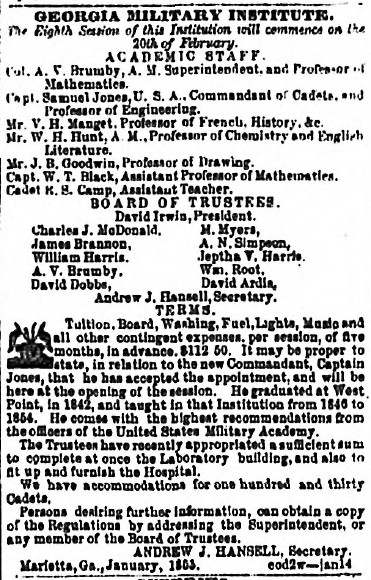 Col. David Dobbs was one the founders of Georgia Military Institute (GMI). His son, D.J. Dobbs was in the first graduating class of the institute. In the mid-1850s, ads for GMI appeared in newspapers throughout the South. Below is one example of an ad for GMI this one. In the Savannah Daily Georgian on 4 February 1855 where David Dobbs is listed as a member of the Board of Trustees.