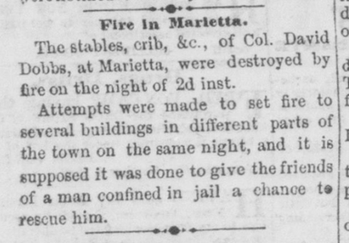 In the 9 November 1858 edition of the Augusta Evening Dispatch, on same page with a dispatch reporting on the filibuster exploits of Col. William Walker down in Nicaragua, there is a report of another fire in Marietta. This time it appears that someone set fire to the stables, crib, etc. of Col. David Dobbs at Marietta. It appears that there were a rash of fires that night set by friends of the man in jail looking for a chance to rescue him.
