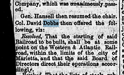 In the Rome (Georgia) Tri-Weekly Courier (10 May 1860) there is part of a report regarding a meeting of the Polk Slate Quarry railroad company. As I reported in my book, David Dobbs was on the board of the company that was formed to build a railroad that would go from somewhere within the limits of Marietta to the terminus of the Western & Atlantic Railroad. In the report it mentions Col. David Dobbs offering a resolution.