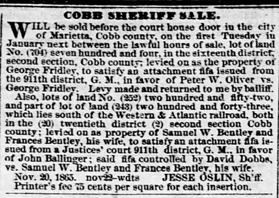 Next up there was an article in the Atlanta Weekly Atlanta Intelligencer edition of November 22, 1865.