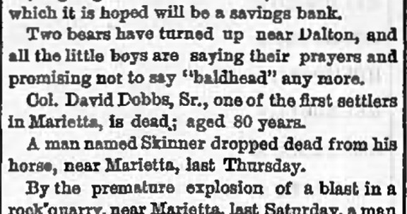 In the 22 July 1871 edition of the Macon Telegraph & Messenger there is a list of news item from the town of Marietta and the surrounding environs of Cobb County. One of the items was announcement that “Col David Dobbs, Sr., one of the first settlers of Marietta is dead; aged 80 years”
