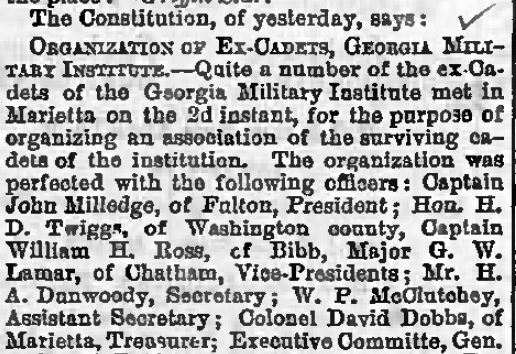 In that same newspaper, the following year, just below an item complaining about “A Radical N—-r in Office” was an entry announcing the organization of ex-cadets of Georgia Military Institute. Perhaps some one should have told them that it was a “lost cause”.