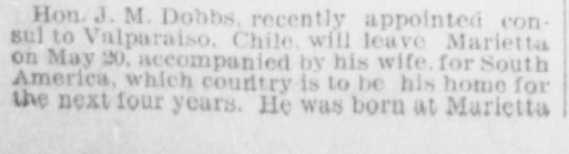 Finally, in the Savannah Morning News (April 25, 1893), I found another article announcing that my great-grandfather James M Dobbs, grandson of David Dobbs, had been appointed consul to Valparaiso Chile. The article states that Dobbs and his first wife would be leaving for South America on May 20. It tells that he was born 33 years ago, which is correct, he was born in 1859. It says that he is the son of David Dobbs graduated from the first class at GMI but then it says that the father died when he was 16 years old. That is not correct. David Judson Dobbs died in 1877 and James was 18 in that year. It then goes on to describe his early years in South America: