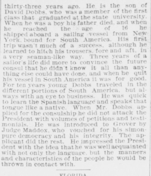 “He shipped aboard a sailing vessel from New York bound for South America. His first trip was not much of a success although he learned to hitch his trousers fore and aft in a very seaman-like way. Three years of a sailor’s life did more to convince the future consul that he did not know it all than anything else could have done, and when he quit his vessel in South America it was for good. For 10 years young Dobbs traveled in different portions of South America but always with an eye to business he was quick to learn the Spanish language and speaks that tongue like a native.“
