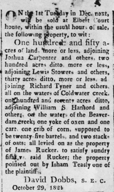 In the November 13, 1824 edition of the Washington News there is a page of public notices of sheriff sales in various Georgia counties. One notice states that on the first Tuesday of January there will be a sale of three slaves to satisfy a fifa (writ of indebtedness). The notice is signed by David Dobbs S.E.C. (Sheriff Elbert County).