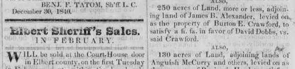 In the Washington News and Planter’s Gazette (28 Jan 1841) there was a notice of a sale of 250 acres of land to satisfy a writ of indebtedness in favor David Dobbs vs. Burton E. Crawford.