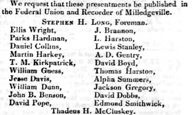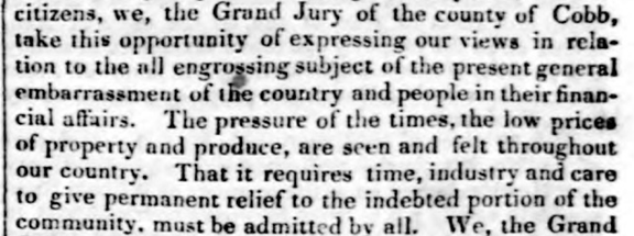 “We the grand jury of the County of Cobb take this opportunity of expressing our views in relation to the all engrossing subject of the present general embarrassment of the country and the people in their financial affairs. The pressure of the times, the low prices of property and produce, are seen and felt throughout the country. That it requires time, industry and care to give permanent relief to the indebted portion of the community, must be admitted by all.”