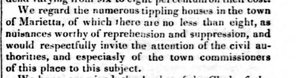 They did not propose a remedy other than asking that the state legislature do something about it. This is also true of a number other grievances that the citizens of Cobb county were asking local and state authorities to investigate and respond to. One of the complaints dealt with the number of “tippling house” (bars, taverns) which they describe as nuisances worthy of reprehension and suppression. To deal with this they “respectfully invite the attention of the civil authorities”.