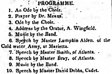 “At an early hour, the band struck up Hail Columbia and the procession begin to form. The Cold Water Army of little boys and the daughters all their loveliness rivaling in whiteness the virgin snow, the cadets (composed of boys from 14 to 18) in beautiful regalia, the sons also in there is, composed the most conspicuous part of the procession, under some of the most beautiful banners that ever waved over faithful sons and lovely daughters, preceded by the band which ever, and anon, sent forth a dulcet note from its brazen instruments, the procession after passing through the principle streets of our village, marched to the stand which had been erected in a beautiful grove. The stage was made large enough to afford ample room for all the speakers, the distinguished guests, the committee of arrangements, the band of music, and the choir; and was tastefully ornamented with evergreens, fest tunes of flowers and appropriate mottos. The moving thousands having arrived at the stand, the exercises begin with an ode from the choir. This was composed of a number of young gentlemen and ladies who sung several odes selected and prepared for the occasion, with thrilling effect. We know not how far our auditory organs were affected by the surrounding circumstances and through the medium of our optics; but certain we are that the dulcet strains fell upon our ears as the ne plus ultra of good singing. But we will give the program of exercises and leave our readers to supply by imagination, what time and space for bit us to give.”