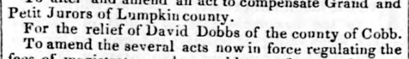 In the Milledgeville Southern Recorder of 25 December 1849, in a multicolumn section titled Georgia Legislature, listed all of the resolutions and bills passed recently by the Georgia State Senate and House. A single line item says, “For the relief of David Dobbs of the county of Cobb.”