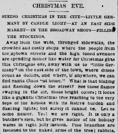 Away from the wide, thronged sidewalks, the crowded and costly shops where the people from the uptown streets and high toned avenues are spending money like water for Christmas gifts this Christmas Eve, away with us to “Little Germany” on the east side of town, where dimes count as dollars, and where, if anywhere, we can find Santa Claus “at home.”