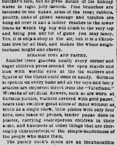 Smaller trees gladden nearly every corner and eager children press around the open stands and look with blissful eyes at the tin soldiers and the figures of the Christ-child done in candy. German is spoken on every hand and all the toys and fancy articles are imported directly from the “Vaterland.” Wreaths of artificial flowers, such as are worn at German picnics, walnuts covered with gold paper, bears that swallow great slices of meat without as much as a single chews, little pianos with only four keys, men made of prunes, tender papas done in plaster, carrying obstreperous children in their arms, and hundreds of other things that are thoroughly characteristic of the simple-headedness of the people who make them.