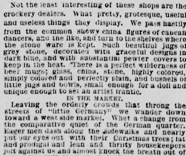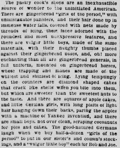 Lying temptingly on the counters are diamond shaped cakes that crack like shells when you bite into them, but which are sweeter than the sweetest nuts to taste. And there are squares of apple cakes, and little German girls with long plaits of light hair hanging down their backs, parrying the apples with a machine of Yankee invention, and there are small boys, not overly clean, scraping coconuts for pies and cakes. The good natured Germans laugh when we buy half a dozen “girls of the period” to put in our sister’s and our cousin’s stockings, and a “vulgar little boy” each for Bob and Joe.