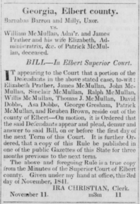 The court order appearing in the local paper of record for the County of Elbert, demands that 12 men and one woman appear in the court to “plead, demure, and answer to said bill.” The case referenced is that of Barnabas Barron and his wife Millie, the former Millicent McMullan, versus William McMullan, administrator, James Prather and his wife Elizabeth, administratrix, etc. of the estate of Patrick McMullan, deceased. The etc. who are identified in the body of the order are the 13 other adult legatees of the estate of Patrick McMullan. The other four involved, and not named in the lawsuit, were minor children.
