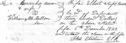 - Barnabas Barron – husband of Millicent (Millie) McMullan, a daughter of Patrick and Sarah. She died 1847. He was justice of the peace in Elbert county.