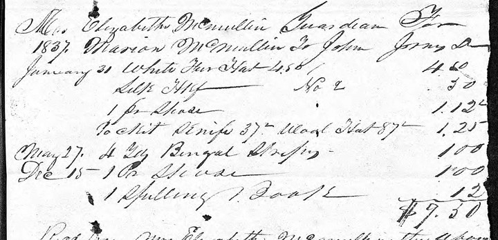 Here is a return for 1839, showing Elizabeth McMullan, guardian for the children, having purchased for Marion McMullan a white fur hat, a silk scarf and a pair of shoes, among other things.