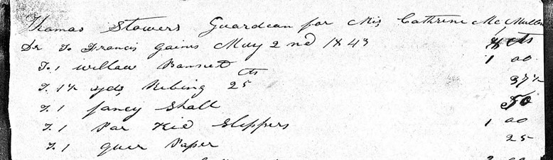 Here we see in 1843, Thomas Stowers, guardian for Miss Catherine McMullan, purchasing for the minor girl some items including a Willow bonnet, fancy shawl, and kid slippers.