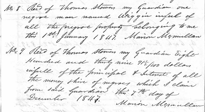 Item 9 reads: “[Received] of Thomas Stower, my guardian, $839 and 91 ½ cents in full of the principal and interest of all the money [from the] hire of Negroes which I claim from said Guardian this seventh day of December 1847.” – signed Marion McMullan.