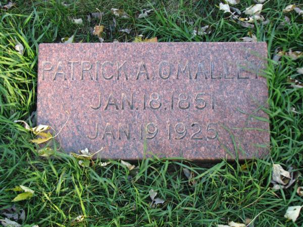 I also located the gravestone of Patrick’s father, Martin O’Malley (1820-1894). He and my great great grandmother, Anna Kirby, are buried in Calvary Cemetery in Austin, Mower County, Minnesota. A photograph of Anna’s gravestone was not available.