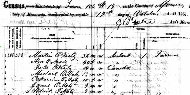 Here is a snippet of the Minnesota state census of 1857 for Mower County, just north of Iowa. It means that they were very early settlers in this section of the state of Minnesota. It tells us that Patrick was born in Canada in 1850. Based on the age of his eldest brother, Peter, the family arrived in Canada around 1843. Six years before the Irish famine.