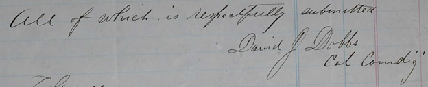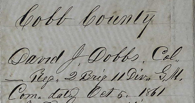 In October 1861, David J Dobbs was commissioned a Colonel in command of __Regiment, Second Brigade, 11th Division, of the Georgia Militia. It was essentially the military unit that represented the Georgia state militia in Cobb County.