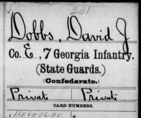 During the Civil War, my great-great-grandfather, DJ Dobbs, held, at one point, the rank of Colonel, at another point, the rank of Private, and on yet another occasion, the rank of Master Private. And no, he was neither promoted nor was he demoted. As I revealed in a previous post, I found a letter from some citizens of Marietta, who requested of the Confederate state’s Secretary of War that “Col. DJ Dobbs of Marietta” be commissioned the county’s enrolling officer for the Confederate Army. As I mentioned, I found no indication that he had been granted that office.