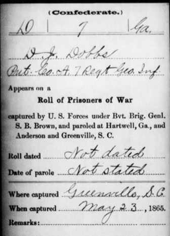 Not long after Sherman’s Army invaded Georgia from Tennessee, and Marietta fell to Union forces, DJ and his family became refugees in South Carolina. About six weeks after Lee’s surrender at Appomattox, DJ was taken prisoner by the Union Army at Greenville, South Carolina. The seventh infantry had been reduced to just one company.