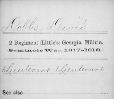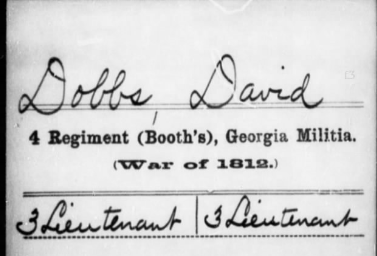 Up first are military records of my third great-grandfather on my mother’s side, Col. David Dobbs of the great state of Georgia. He served for many years in the Georgia militia and began his career as an officer with the rank of Third Lieutenant in the 4th (Booth’s) Regiment during the Creek War of 1814. I discuss David’s movements during this period in my book, Gathering Leaves.