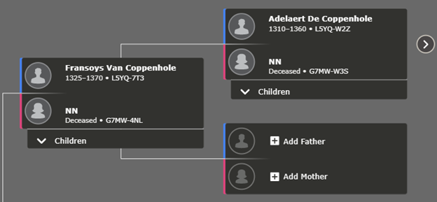 Finally, I found another long pedigree line dating back to the middle of the 14th century. This pedigree line was an extension of a line of which I was already aware. There are a total of three lines that connect me to an ancestor on my father’s side named Hermes Van Copenolle, who lived in the 1500s. He was my 11th great-grandfather. I discovered that other researchers have extended this line back 200 years to an ancestor named Adelaert de Coppenhole, who lived in the 1300s. Adelaert would be my 18th great-grandfather.