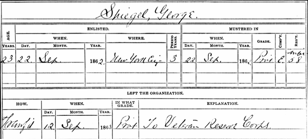 The second item I found was a record showing that a 23-year-old George Spiegel enlisted a few days after the Battle of Antietam on 22 September 1862. This page from the New York muster rolls shows that he enlisted in New York City for three years and was enrolled as a private company E of the 58th volunteer Regiment, New York Infantry. Further, it shows that he was mustered out on 12 September 1863 as a private in the Veteran Reserve Corps.