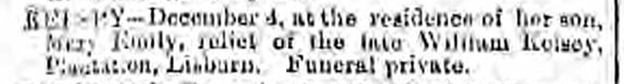 KELSEY — December 4, at the residence of her son, Mary Emily, relict of the late William Kelsey, Plantation, Lisburn. Funeral private.