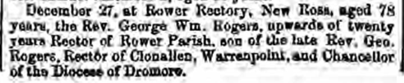 December 27, at Rower Rectory, New Ross, age 78 years, the Rev. George William Rogers, upwards of 20 years rector of Rower Parish, son of the late Rev. George Rogers rector of Cloneallen, Warrenpoint, and Chancellor of the diocese of Dromore.