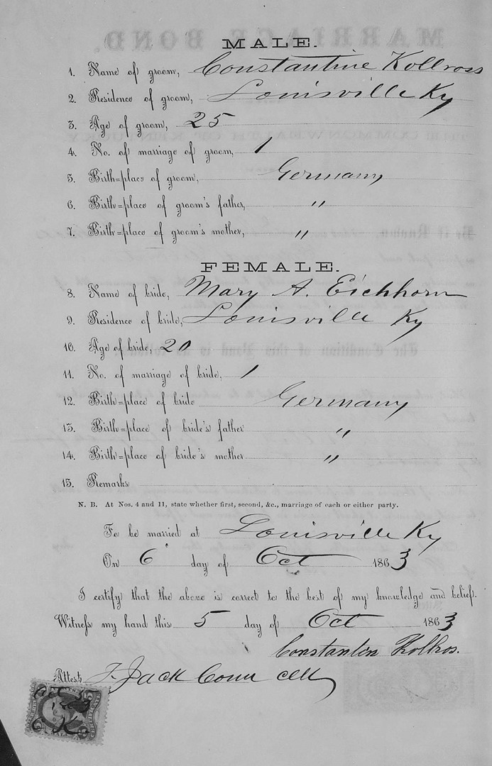 Here’s something I’ve not seen before: a Marriage Bond. As I was doing some research this afternoon I came across a document titled marriage bond and it was essentially a contract signed by my great great grandfather Constantine Kollros and his future brother-in-law, Erhardt Eichhorn. The purpose of the document was to confirm Constantine’s intent to marry, Erhardt’s sister, Maria Eichhorn. Constantine was required to put up a bond of $100 that would be paid, presumably to Erhardt in the event that the marriage did not go through. The document was dated October 5, 1863, the day before Constantine and Maria were married. The couple had several children, one of whom was my great grandfather, Erhardt Joseph Kollros.
