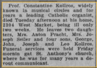Shown below is another find that I made this afternoon, the obituary of Constantine Kollros that appeared in the Kentucky Irish American (Louisville, Kentucky) 2 December 1916 Saturday on page 1. The title professor was commonly given to orchestra and band leaders in those days. Think of “professor” Harold Hill in The Music Man.