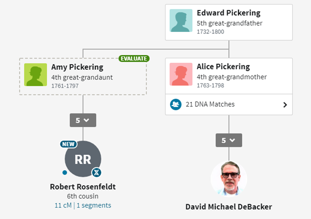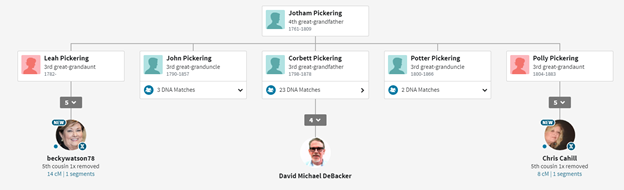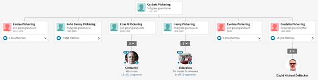 It is in the next generation that connections to siblings of Cordelia Pickering occur. When I look at Corbett Pickering (1798-1878) and his wife, Tamar Denny (1802-1890), I see that for both of them, I have 31 DNA matches, 18 of whom are my close cousins and the remaining are descendants of siblings of Cordelia Pickering. Therefore, our common ancestors are Corbett Pickering and Tamara Denny.
