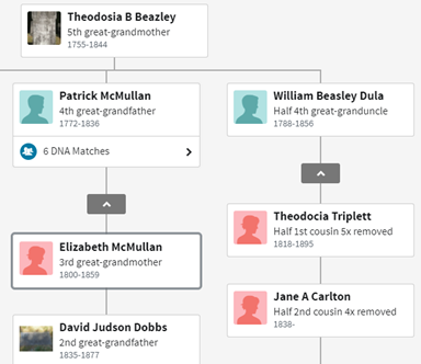 In looking at my DNA test results in the Thru Lines section at Ancestry.com, I see where it says for my fifth great-grandmother Theodosia Beck Beasley there are a total of 27 DNA matches. Six of those matches are for descendants of my fourth great-grandfather, Patrick McMullan. One match is on a descendent of Patrick’s brother James, and a total of 19 matches occur with descendents of a sister of Patrick’s, Katharine McMullan, who married a man named Shiflett. These twenty-six are all descendants of John McMullan. But there is, however, one DNA match with a half sixth cousin who claims descent from Theodosia Beck Beasley by way of William Beasley Dula, son of William Dula. Additionally, there are at least three other people that this person and I match with.